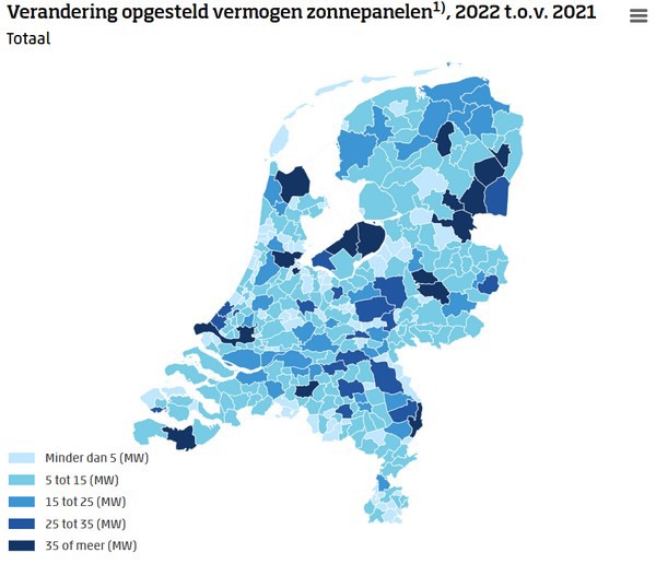 In 2022 nam het totaal opgesteld vermogen van zonnepanelen in alle gemeenten van Nederland gemiddeld met 30 procent toe ten opzichte van 2021. In Dronten was de toename met 161 megawatt (MW) het grootst door de aanleg van het grootste zonnepark van Nederland. Met meer dan 100 MW volgen Borger-Odoorn en Hoogeveen. Het opgestelde vermogen van zonnepanelen op woningen groeide het sterkst in Utrecht, Rotterdam en Tilburg.