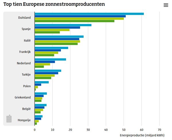Nederland staat in de top vijf van landen met de hoogste zonnestroomproductie in Europa sinds 2022. De productie groeide sterk in vergelijking met andere Europese landen. Sinds 2019 is de Nederlandse zonnestroomproductie meer dan verdrievoudigd. In Polen en Hongarije was de groei het grootst, maar daar was de productie in 2019 een stuk lager dan in Nederland.