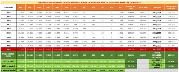 Opvallend is de toename van de import uit Egypte: 97% meer dan in de eerste vijf maanden van 2022 (+171.200 ton) en 57,3% meer dan het vijfjarig gemiddelde (+126.600 ton). Met 347.576 ton had Egypte een aandeel van 94,9% in de import van de EU in de eerste vijf maanden van 2023.
