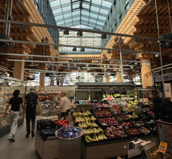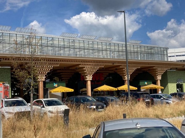 Vandaag heb ik weer een plaatje gevonden. De REWE green farming in Wiesbaden. Een supermarkt met een kas erop waarin kruiden verbouwd worden.