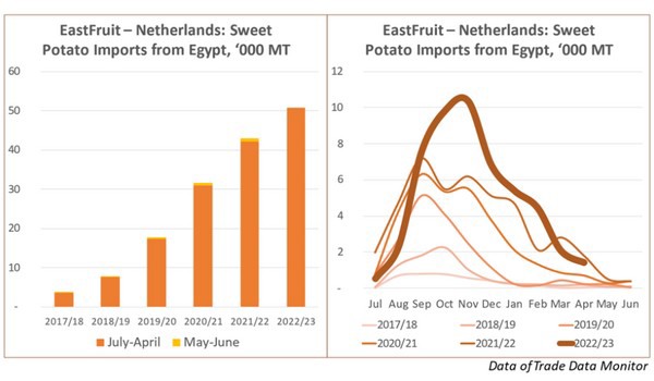 In 2021/22 exporteerde Egypte 42.000 ton zoete aardappelen naar Nederland, terwijl de export in de eerste negen maanden van het huidige seizoen al 51.000 ton bereikte. Maar aangezien de export in mei-juni meestal vrij laag is, zal het eindresultaat niet wezenlijk meer veranderen.