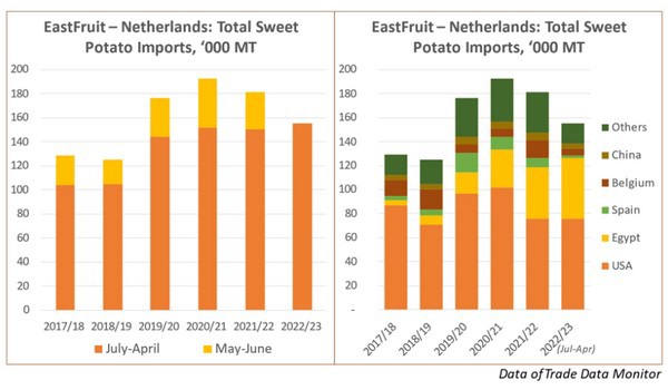Inmiddels breidt Egypte als grote leverancier jaarlijks zijn aanwezigheid op de Nederlandse markt uit. De VS, de grootste exporteur naar Nederland, heeft de afgelopen vijf seizoenen zijn export van zoete aardappelen naar Nederland met 13% zien dalen tot 76.000 ton. De export van andere landen neemt toe, maar hun volumes zijn nog onbeduidend in vergelijking met Egypte of de VS.