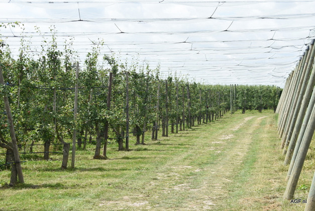 "Langzaamaan zijn we in verloop van tijd daarom overgestapt op een traditioneel antihagelsysteem met houten palen, die je in andere percelen van het bedrijf ziet. Vervolgens zijn we gaan kijken naar het nieuwste systeem met de betonpalen met grijze netten, waarover we heel tevreden zijn. Alleen komt daar dus een fors kostenplaatje bij kijken. We zien dat het steeds belangrijker wordt, maar zullen het langzaam uit moeten bouwen om al ons fruit te beschermen."