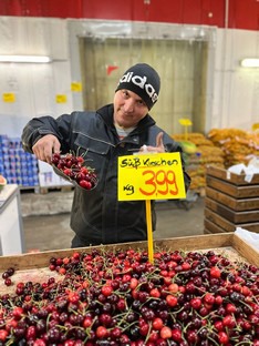 Rechts: Personeelslid Azizi Shoheb toont Spaanse kersen.