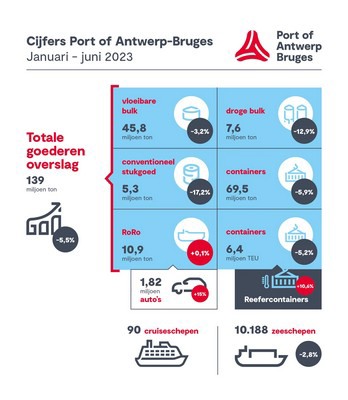 De totale goederenoverslag van Port of Antwerp-Bruges bedroeg in de eerste zes maanden van dit jaar 139 miljoen ton, een daling van 5,5% ten opzichte van dezelfde periode vorig jaar. Terwijl de wereldwijde economische situatie zorgt voor een daling in de vraag naar containervervoer, tonen de overige goederenstromen een wisselend beeld. In de huidige onstabiele economische omstandigheden houdt de haven goed stand en wint in de containerbehandeling bovendien aan marktaandeel ten opzichte van de andere havens in de Hamburg - Le Havre range, zo meldt het havenbedrijf.