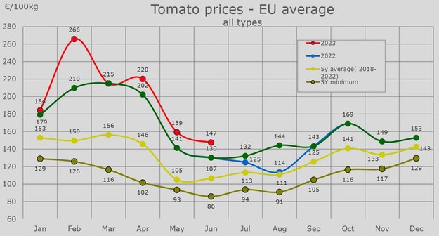 Voor de in het dashboard opgenomen landen afzonderlijk komen de kiloprijzen uit op 1,49 euro in Italië, 1,26 euro in Spanje, 1,20 euro in Nederland en 2,70 euro in Frankrijk. Voor Spanje en Frankrijk geldt dat er sprake is van de gebruikelijke prijsstijging in juni, al is de prijsstijging in Frankrijk dan de afgelopen vijf jaar (18% stijging t.o.v. mei in vergelijking met normaal 4%).