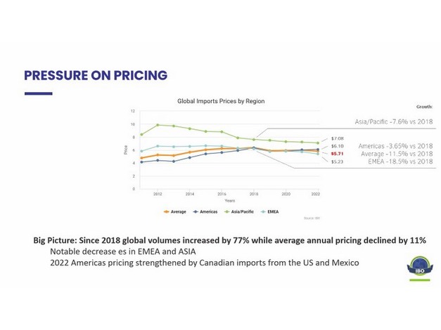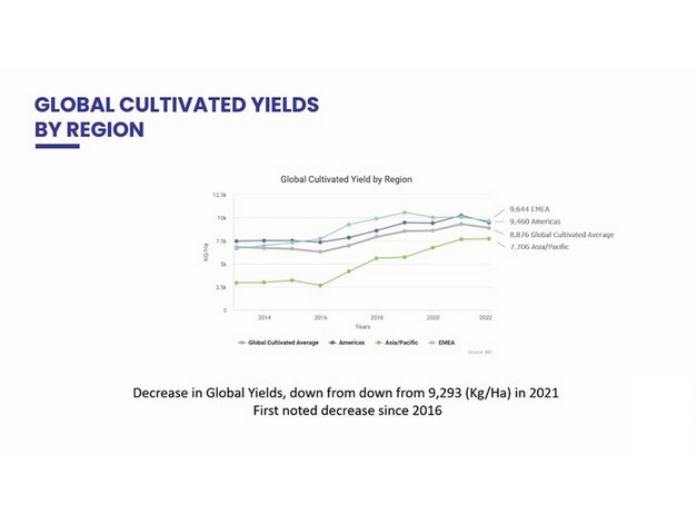 Cort Brazelton, hoofdredacteur en co-auteur van het rapport: "Zonder de daling van de gemiddelde opbrengst zou er 96,3 ton meer zijn geoogst. Nu is de groei afkomstig van jonge percelen die de volledige productie bereiken. Sinds 2018 is het wereldwijde oogstvolume met 77% gestegen, terwijl de prijs jaarlijks met 11% is gedaald. In de prijsstelling zie je niet meer de hoge pieken en waarden zoals in het verleden. Het blijft gemiddeld consistent, afhankelijk van regio en markt. Er zijn opmerkelijke prijsdalingen in Europa, het Midden-Oosten, Azië en Afrika. De prijsstelling voor 2022 werd versterkt door Canadese import uit de VS en Mexico."