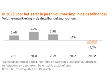 “De 2% krimp komt met name door een sterke terugval in het non-food segment, dat het meest conjunctuurgevoelig is", stelt Katinka Jongkind, sectoreconoom Retail bij ING Research. "Door de hoge inflatie en een aanhoudend laag consumentenvertrouwen houden consumenten in de winkelstraat meer en meer de hand op de knip. Zeker wat betreft niet-noodzakelijke goederen zoals woninginrichting en elektronica. De winkelverkopen in vrijwel alle non-food segmenten vallen dan ook sterk terug ten opzichte van 2022, toen er nog sprake was van een inhaalslag in de winkelstraat na de coronapandemie. Naar verwachting vindt er in alle non-food segmenten, behalve die van persoonlijke verzorging, volumekrimp plaats. De grootste krimp doet zich voor bij woon- en elektronicawinkels.”