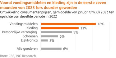 Voor de detailhandel verwachten we voor 2023 gemiddeld een omzetgroei van 5%. De omzetgroei komt vrijwel volledig door de fors hogere prijzen in de detailhandel. In de eerste zeven maanden van 2023 stegen de prijzen van voedingsmiddelen gemiddeld met 16%. Ook kleding werd met 11% fors duurder, evenals persoonlijke verzorgingsproducten, zoals shampoo, parfum etc. (+9%). Hoewel de grootste prijsstijgingen naar verwachting achter de rug zijn, blijft de algemene inflatie dit jaar met gemiddeld rond de 4,5% relatief hoog.