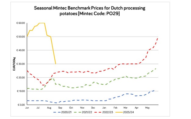 De Europese prijzen voor verwerkingsaardappelen zijn verder gedaald na de recordhoogten van juli, toen steeds grotere hoeveelheden nieuwe oogst op de markt kwamen. De Mintec Benchmark Prijzen voor Nederlandse verwerkingsaardappelen [Mintec Code: PO29] werden beoordeeld op €30/100kg op 22 augustus, een daling van 50% ten opzichte van de recordhoogte van €60/100kg op 25 juli.