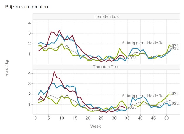 De middenprijs voor losse tomaten zakte nipt onder het vijfjarig gemiddelde in week 34. Juli en augustus lieten vaker ondergemiddelde prijzen zien. In week 34 noteren losse tomaten 61,5 eurocent. Trostomaat doet 70 eurocent per kilo en blijft wel boven het vijfjarig gemiddelde.