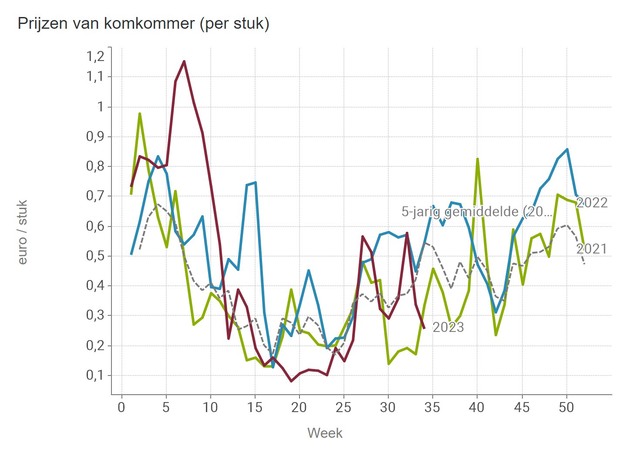 Na een heel slecht voorjaar met lange tijd ver ondergemiddelde komkommerprijzen vonden de prijzen vanaf week 25 wel de weg omhoog. In week 27 en week 32 piekten de prijzen zelfs even ruim boven het prijsgemiddelde uit, maar vervolgens doken de prijzen ook weer net zo hard tot onder het prijsgemiddelde. Na de piek van week 32 nog zelfs weer iets harder dan na de piek in week 27.