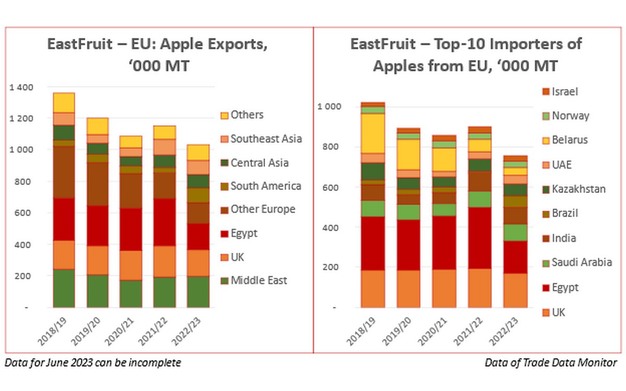 Zo heeft Egypte zijn status van grootste importeur van appelen uit de EU in het verkoopseizoen 2022/23 verloren, met een invoer van slechts 163.000 ton. Ter vergelijking: in het vorige verkoopseizoen bedroeg de invoer 302.000 ton en in de afgelopen vier seizoenen nooit minder dan 251.000 ton.