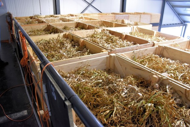 De knoflook wordt met een klembandrooier gerooid en ligt daarna op het veld om te drogen. Met de investering in de nieuwe bewaring is deze risicovolle veldperiode aanzienlijk verkort. Na het laden in kisten wordt de knoflook voor de droogwand geplaatst en wordt het droogproces door de Vision Control geregeld met de modulerende gaskachels en de automatische luikenregeling. Drubay is enthousiast over de het drogen in de bewaring: “Met de nieuwe bewaring heb ik veel meer controle over de kwaliteit van de knoflook.”