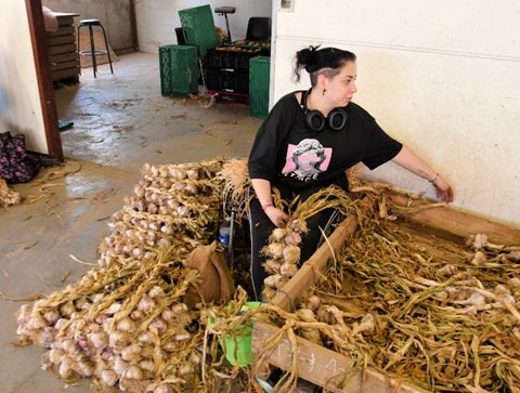 Een deel van de 18 ha knoflook die Drubay teelt wordt al in de winterperiode geplant en de oogst kan daarom al vanaf eind juni plaatsvinden. Na de oogst wordt er gedroogd in de bewaring tot er een relatieve luchtvochtigheid van rond de 65% wordt bereikt. Daarna worden de kisten leeggestort op de sorteermachine en wordt de knoflook schoongemaakt en op maat gesorteerd. Elke knoflookbol gaat door de handen van één van de medewerkers om alle losse vellen en loof te verwijderen en de verschillende maten bij elkaar te leggen. “Dit proces vraagt nog steeds veel handwerk. Er zijn in het hoogseizoen tot wel 50 medewerkers op het bedrijf. Dat kan moeilijk anders omdat het loof aan de bol ook heel moet blijven voor de volgende stap in het proces” zegt Drubay. De gesorteerde knoflookbollen worden vervolgens per maat in een lage kist gelegd.