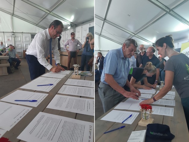 Links ondertekent de landbouwminister het convenant. Rechts helpt Loes Mertens één van de ondertekenaars.
