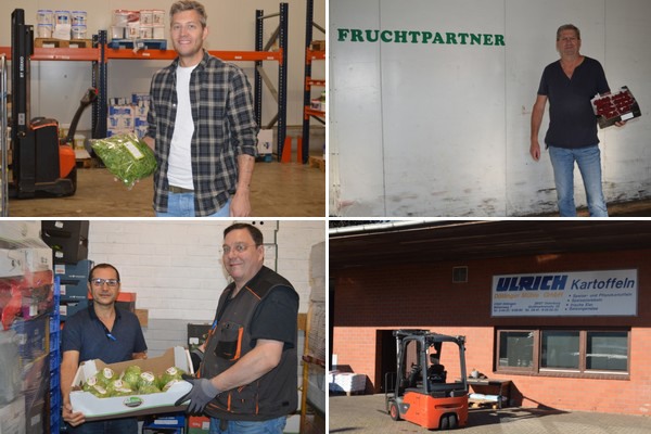Oldenburgse groothandelaren. Met de klok mee: David Sommer van AS Frucht, Thorsten Hinz van Fruchtpartner GmbH, de voorkant van de aardappelgroothandel Ulrich en Marina-baas Ekrem Kusu samen met zijn magazijnmanager
