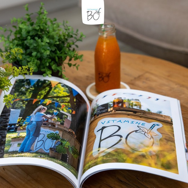 Eigen magazine met smoothie- en fruitfoto's en een kijkje achter de schermen bij Vitamine Bo