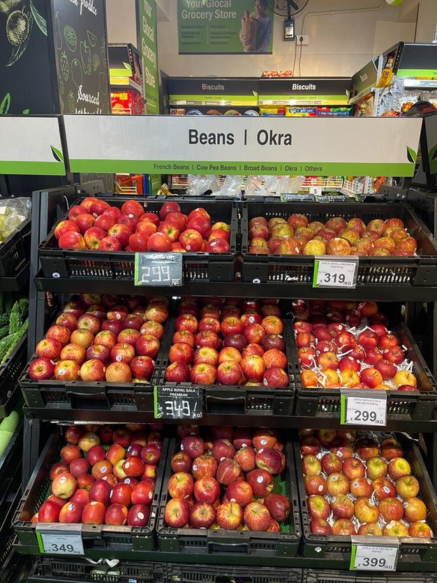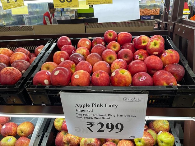 Appelen zijn heel gebruikelijk in India en supermarkten hebben er een breed assortiment van. Prijzen staan in roepies (1 roepie = € 0,011). De prijs van Royal Gala’s is € 3,95 per kilo.