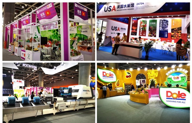 Linksboven: Stand Vietnam; rechtsboven: Amerika stand; linksonder: Reemoon, de tentoongestelde apparatuur voor de bewerking van groenten en fruit trok veel aandacht; rechtsonder: Dole China, met een reeks vruchten zoals Dole Philippine Gold Puyat durian