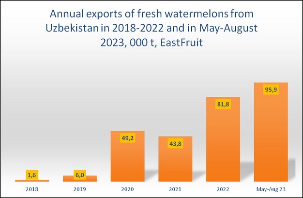 In 2022 exporteerde Oezbekistan 81,8 duizend ton watermeloenen, wat een historisch record werd en het vorige record met 67% overtrof. In 2023 heeft het land dit record al overtroffen door bijna 96 duizend ton watermeloenen te exporteren in mei-augustus 2023. Het is dus mogelijk dat het land tegen het einde van september 2023 voor het eerst de historische drempel van 100.000 ton zal overschrijden en daarmee tot de top 10 grootste wereldwijde exporteurs van watermeloenen zal behoren.