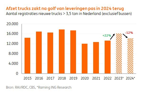 De vraag naar transportmaterieel neemt af, maar door uitzonderlijke jaren met productiebeperkingen, opgestapelde orders en lange levertijden groeit het aantal nieuw geleverde trucks dit jaar nog met ruim 20%. Als gevolg van de lagere vervoersvraag, sterke stijging van de rente en hogere prijzen van nieuw materieel, lopen nieuwe orders nu terug en krimpt de verwachte afzet in 2024.