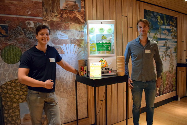 Amike Theune en Joery Goense met geschilde apeleen en peren voor de horeca en consument