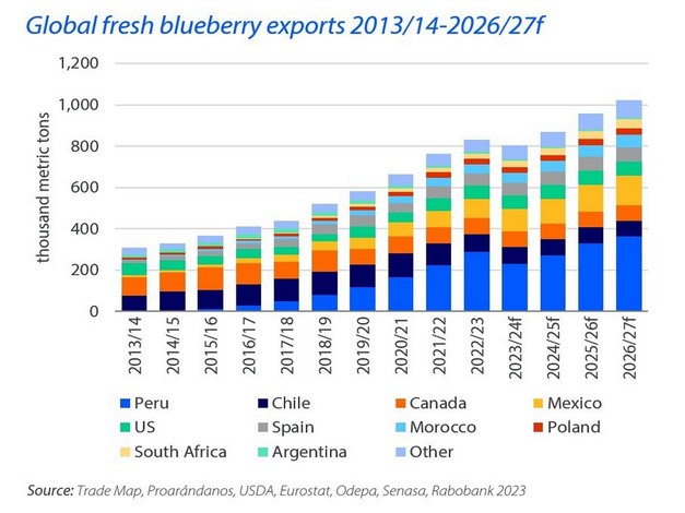 Peru, Mexico en Chili blijven de grootste exporteurs in de verssector, maar een warme winter in Peru heeft de oogst vertraagd en zal een negatieve invloed hebben op de opbrengsten en verzendingen. In waarde vertegenwoordigt zachtfruit het grootste deel van Mexico's export van tuinbouwproducten en voedingsmiddelen en deze categorie is de snelst groeiende binnen de tuinbouwsector in het land. De Chileense export van blauwe bessen is daarentegen gedaald sinds de piekexport van het seizoen 2020/21 en de Rabobank verwacht een verdere daling in 2023/24.