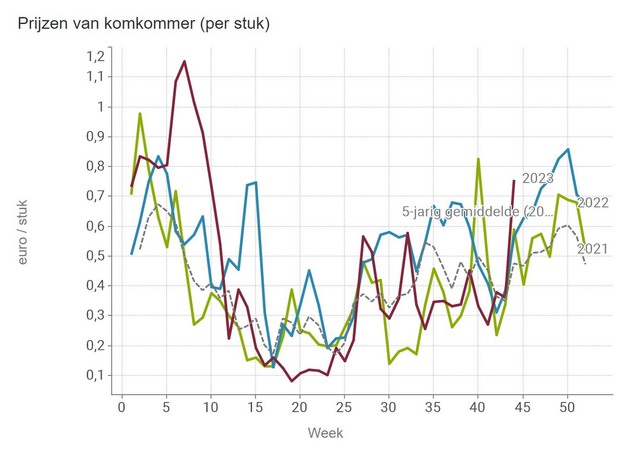 Vorig jaar werd een dergelijk hoog VBT-prijsniveau voor komkommers ook gerealiseerd, maar toen pas eind november. De jaren voordien kon de prijs helemaal niet tippen aan deze prijspiek.