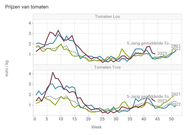 De harde daling van de tomatenprijs is vorige week afgeremd. De VBT-middenprijzen komen uit op ruim 1,08 euro voor 1 kilo losse tomaten en net geen 1,40 voor trostomaten. Daarmee is nog altijd sprake van bovengemiddelde prijzen en liggen de prijzen ook hoger dan de afgelopen jaren begin november. Dat geldt ook voor komkommer en paprika.
