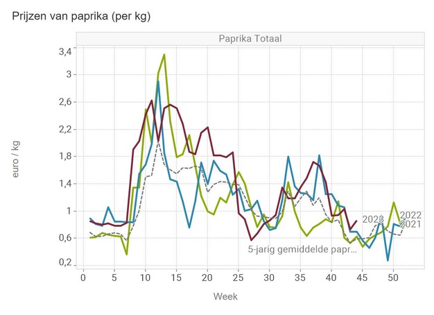 De middenprijs voor paprika, als we alle kleuren even op een hoop gooien, ligt ook boven het vijfjarig gemiddelde. Vorige week verdubbelde de prijs van groene paprika's en liep ook de prijs voor rood iets op tot 96,7 eurocent per kilo gemiddeld. De middenprijs voor geel komt met 49,1 eurocent fors lager uit.