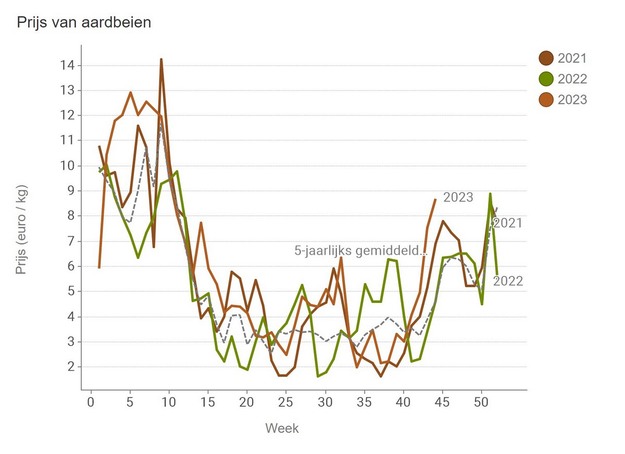 Net als sla komen ook de aardbeien weer uit de kassen. De middenprijs over week 44 komt uit op 8,69 per kilo. Een prijs die voor het laatst in 2016 begin november werd gerealiseerd. Elsanta doet het met ruim 9,38 euro nog beter.