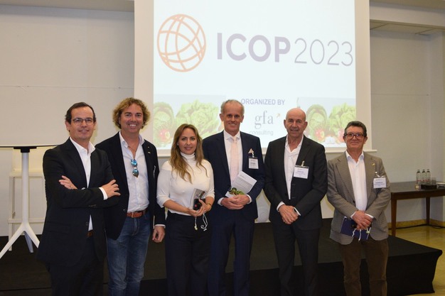 Gonçalo Andrade, van Portugal Fresh, en Wolfgang Braunstein, van gfa-consulting, samen met de leden van CASI Julián Rodríguez, Esther Oliva, Antonio Bretones en Celedonio Pleguezuelos, op de recente ICOP 2023.