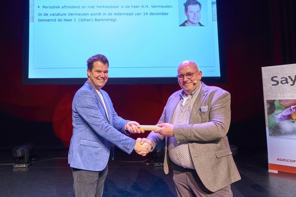 Tijdens de centrale ledenvergadering heeft algemeen directeur Jan van Hoogen het stokje overgedragen aan zijn opvolger Mark Zuidhof. Op 16 september 2022 werd Mark Zuidhof benoemd tot operationeel directeur. Sindsdien vormde Zuidhof samen met Van Hoogen de statutaire directie van Agrico. Met ingang van 1 januari 2024 treedt Jan van Hoogen af. Jan van Hoogen is sinds 1989 werkzaam voor Agrico, waarvan ruim 10 jaar als CEO. Hij zal na zijn aftreden nog enkele maanden als adviseur aan Agrico verbonden blijven. Als dank voor zijn betrokkenheid en enorme inzet voor de coöperatie is Jan van Hoogen tevens benoemd tot lid van verdienste.