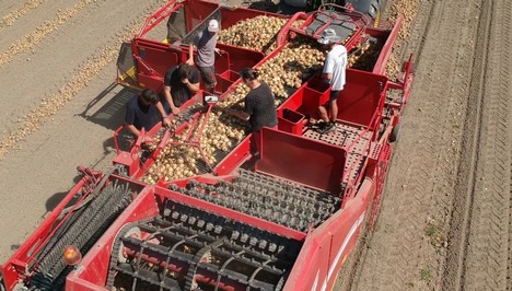De vers gerooide aardappelen ondergaan een eerste sortering op het veld.