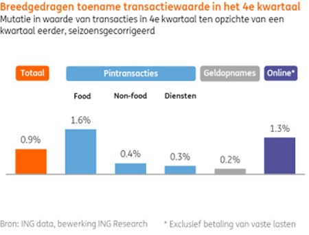 Analyseren we de transactiedata dan zien we dat de waarde van de 'vrije' uitgaven van consumenten aan goederen en diensten (consumptie exclusief vaste lasten) is toegenomen het afgelopen kwartaal. De totale waarde van consumententransacties (pinbetalingen, geldopnames en onlinebetalingen) en betalen op het internet, steeg in het vierde kwartaal van 2023 met 0,9% ten opzichte van het kwartaal ervoor.