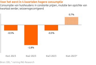 Transactiecijfers gebruiken we als indicatie voor hoe de vrije consumptie, ruwweg de helft van de totale consumptie van huishoudens, zich ontwikkelt. Al met al duiden de transactiecijfers op een stijging van de vrije uitgaven in het vierde kwartaal ten opzichte van een kwartaal eerder. Naar verwachting van ING Research zal zich dat ook vertalen in een toename van de consumptie in het vierde kwartaal. Voor het eerst in vier kwartalen zal de consumptie van huishoudens dan weer toenemen. Verder vooruitkijkend naar 2024 zal de consumptie waarschijnlijk verder herstellen. De verwachte toename van de koopkracht en verder herstel van de huizenmarkt zijn gunstige voortekenen voor een positieve ontwikkeling van de consumptie komend jaar. Deze aantrekkende consumptie zal in 2024 naar verwachting één van de belangrijkste steunpilaren onder de groei van de Nederlandse economie zijn.