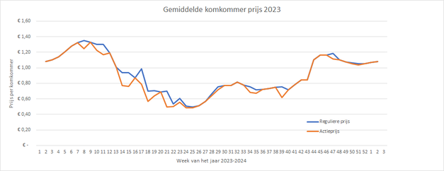 Komkommerprijzen laten geen spannende ontwikkelingen zien. Dirk zet de bodemprijs met €0,89 per komkommer. De andere supermarkten hanteren prijzen van rond de 1,10-1,15 euro. Dat is op hetzelfde niveau als vorig jaar zoals blijkt uit onderstaande grafiek van de gemiddelde online komkommerprijs in het afgelopen jaar bij alle supermarkten.