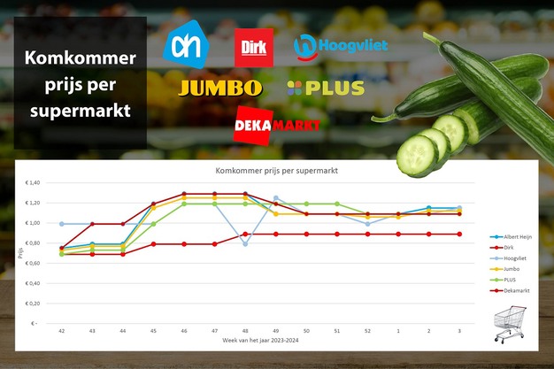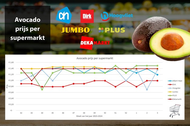 Prijsdata zijn afkomstig van Supermarktscanner.nl en gebaseerd op de online prijzen in de webwinkels van Albert Heijn, Jumbo, Plus, Dekamarkt, Dirk en Hoogvliet. De prijs is een gemiddelde, inclusief de promoties. In deze prijsvergelijking zijn herkomst en kwaliteit niet meegenomen. De meeste supermarkten vermelden deze gegevens niet op hun website, Hoogvliet en Jumbo die vermelden het land van herkomst. Mogelijk worden in de bovenstaande prijsvergelijking onrijpe avocado’s met rijpe vergeleken en Spaanse komkommers met Hollandse."