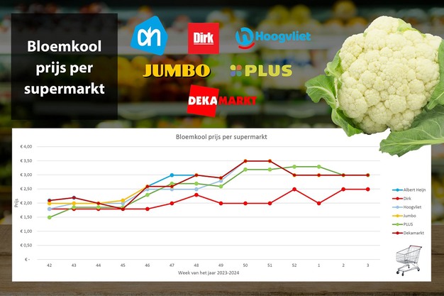 De bloemkool is flink duur voor de consument. Tot en met week 46 lijken de prijzen dicht blij elkaar te liggen, rond de 2 euro. Sinds week 46 is de prijs stijgend en lag bij de meeste supermarkten in weken 50 en 52 zelfs op €3,49 per stuk. Sinds begin dit jaar zakte de prijs naar bijna 3 euro per stuk. Bij Hoogvliet is bloemkool in week 52 uit het online assortiment gehaald. Dirk kan de prijs flink lager houden, in de duurste weken scheelt dat zelfs €1,50, in week 3 ligt de prijs 50 cent lager dan bij de rest.