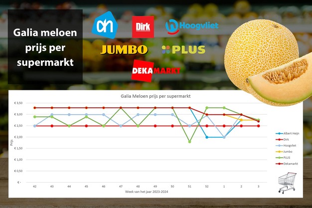 De prijs van Galia meloen is vergeleken met de andere producten in de AGF-monitor vrij stabiel, sinds week 51 is er een dalende prijstrend. In week 3 kruipen de 5 andere supermarkten tegen de prijs van Dirk aan die al wekenlang de prijs op €2,49 houdt.