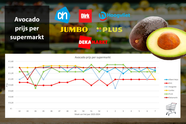 Prijsdata zijn afkomstig van Supermarktscanner.nl en gebaseerd op de online prijzen in de webwinkels van Albert Heijn, Jumbo, Plus, Dekamarkt, Dirk en Hoogvliet. De prijs is een gemiddelde, inclusief de promoties. In deze prijsvergelijking zijn herkomst en kwaliteit niet meegenomen. De meeste supermarkten vermelden deze gegevens niet op hun website, Hoogvliet en Jumbo vermelden het land van herkomst. Mogelijk worden in de bovenstaande prijsvergelijking onrijpe avocado’s met rijpe vergeleken en Spaanse komkommers met Hollandse.