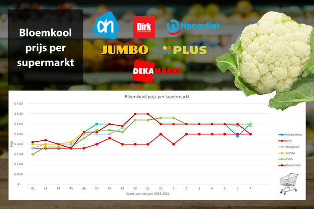 Bloemkool gaat deze week in de aanbieding bij Dekamarkt waardoor deze even duur is als de prijs bij Dirk. Hoogvliet biedt bloemkool wederom 10 cent goedkoper aan dan Plus, Jumbo en Dekamarkt waar de bloemkool al weken 2,99 kost.