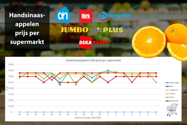 In handsinaasappelen maakt PLUS deze week het verschil met een flinke aanbieding, van 3,29 voor 2,49 voor een netje van 2 kilogram. Hoogvliet doet niet mee in deze vergelijking omdat ze online geen netjes van 2 kilogram verpakkingen aanbieden.
