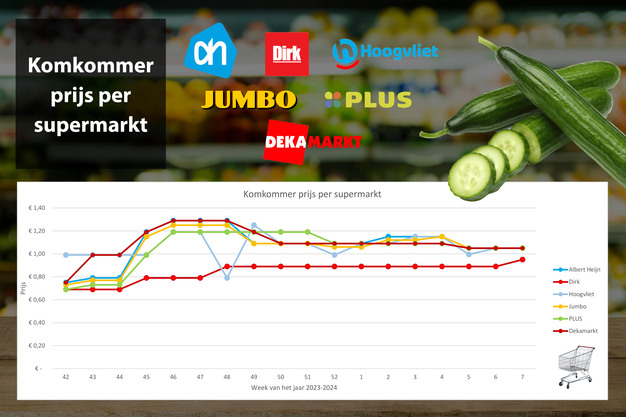 Dirk verhoogt de prijs van komkommer, na wekenlang 0,89 cent per stuk te rekenen kost een komkommer nu 0,95 cent. De andere supermarkten houden unaniem de online prijs op 1,05 euro per stuk. Dat is flink lager dan de gemiddelde prijs vorig jaar, in week 7 van 2023 kostte een komkommer online gemiddeld 1,28 euro per stuk.
