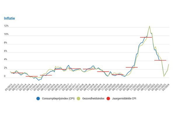 De Belgische inflatie stijgt in februari van 1,75% naar 3,20%, zo meldt Statbel. De consumptieprijsindex stijgt deze maand met 0,93 punt of met 0,71%. De inflatie voor voeding (inclusief alcoholische dranken) daalt voor de 11de maand op rij en komt deze maand uit op 4,65% tegenover 6,58% in januari.