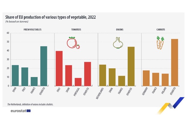 De teelt van bepaalde groenten is sterk geconcentreerd in enkele landen. Italië was bijvoorbeeld goed voor 40% van de in de EU geoogste tomaten in 2022, gevolgd door Spanje (24%) en Portugal (9%).