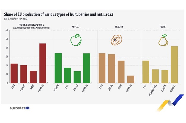De belangrijkste appeltelers in 2022 waren Polen (34%), Italië (18%) en Frankrijk (14%) en de belangrijkste perentelers Italië (25%), Nederland (17%) en België (17%). Voor perziken waren drie landen goed voor meer dan 90% van de oogst: Italië (34%), Griekenland (33%) en Spanje (24%).