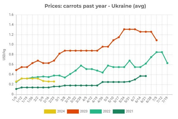 Het is de moeite waard om op te merken dat de huidige prijs van wortelen in Oekraïne al 72% lager is dan eind februari 2023. Tegelijkertijd verwachten de meeste marktdeelnemers verdere prijsdalingen, aangezien de handelsactiviteit in dit segment vrij laag is.