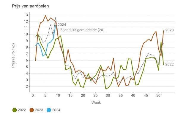 De middenprijs voor aardbei ligt tot slot op afgerond 11,5 euro per kilo. Nipt ondergemiddeld, ondanks dat grijs weer teelten heeft vertraagd. Grote volumes met Pasen, dat vroeg valt, worden niet verwacht.